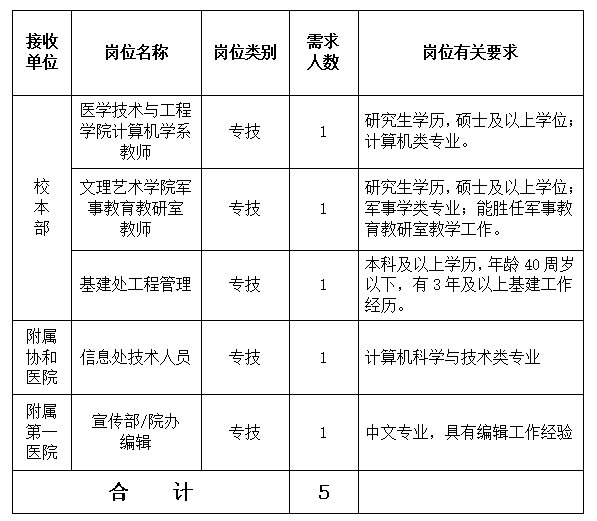 应聘附属医院岗位的军转干部向医院报名,附属第一医院报名联系人:陈老师(0591-87981022),附属协和医院报名联系人:郑老师(0591-86218365)