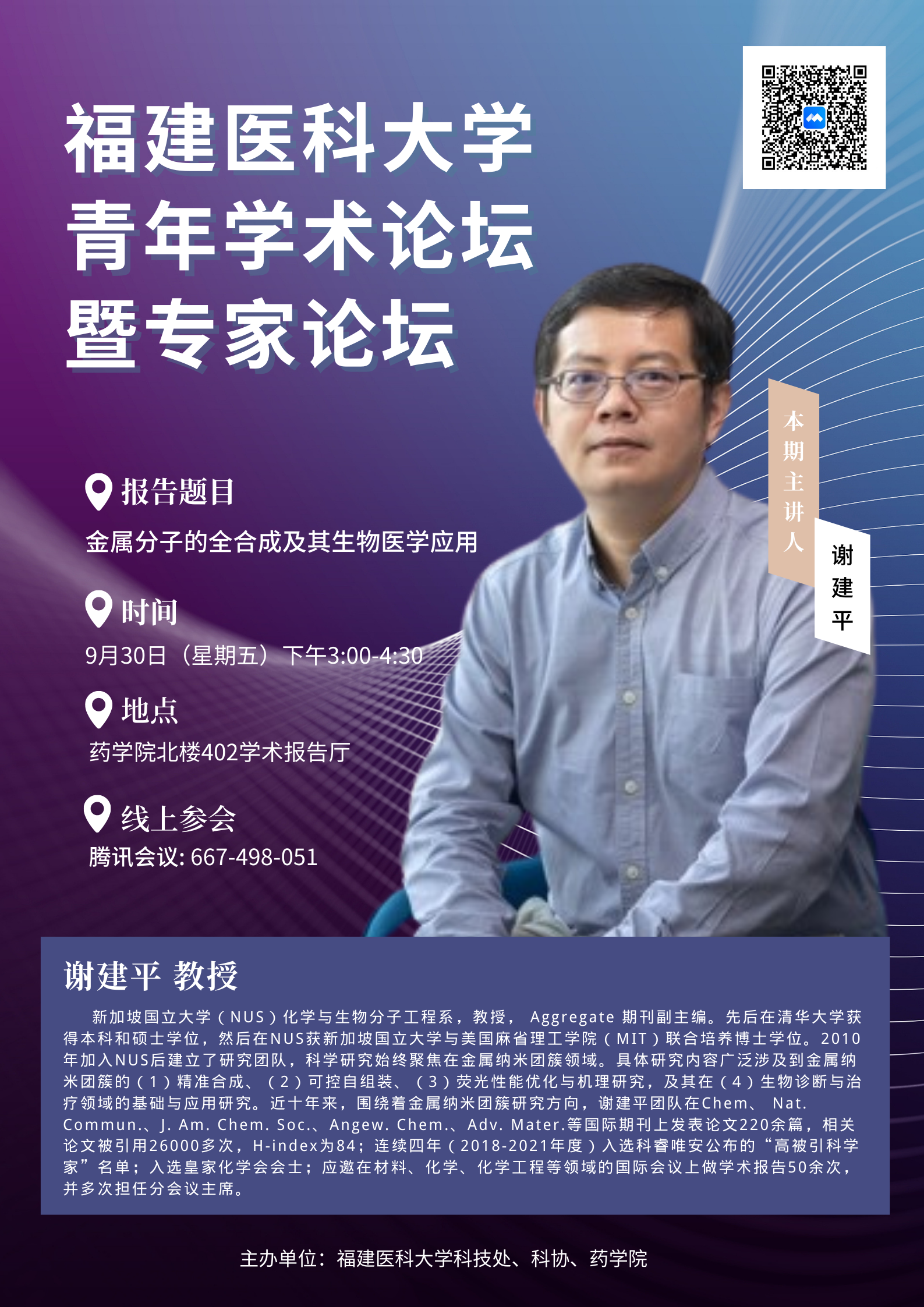 谢建平,新加坡国立大学(NUS)化学与生物分子工程系,教授, Aggregate 期刊副主编。先后在清华大学获得本科和硕士学位,然后在NUS获新加坡国立大学与美国麻省理工学院(MIT)联合培养博士学位。2010年加入NUS后建立了研究团队,科学研究始终聚焦在金属纳米团簇领域。具体研究内容广泛涉及到金属纳米团簇的(1)精准合成、(2)可控自组装、(3)荧光性能优化与机理研究,及其在(4)生物诊断与治疗领域的基础与应用研究。近十年来,围绕着金属纳米团簇研究方向,谢建平团队在Chem、 Nat. Commun.、J. Am. Chem. Soc.、Angew. Chem.、Adv. Mater.等国际期刊上发表论文220余篇,相关论文被引用26000多次,H-index为84;连续四年(2018-2021年度)入选科睿唯安公布的“高被引科学家”名单;入选皇家化学会会士;应邀在材料、化学、化学工程等领域的国际会议上做学术报告50余次,并多次担任分会议主席。