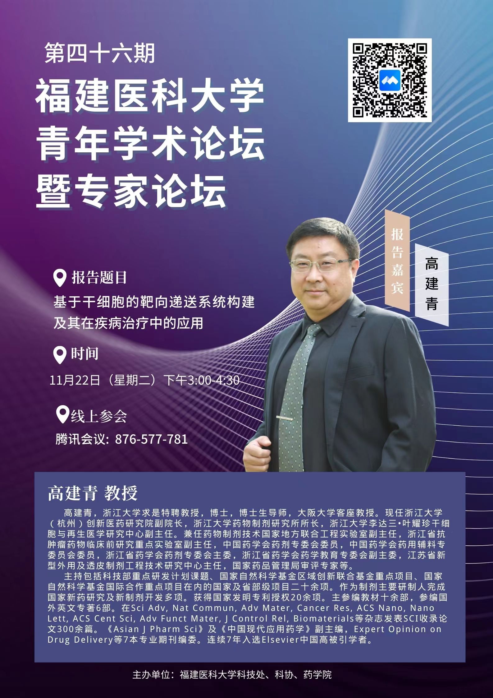 高建青,浙江大学求是特聘教授,博士,博士生导师,大阪大学客座教授。现任浙江大学(杭州)创新医药研究院副院长,浙江大学药物制剂研究所所长,浙江大学李达三•叶耀珍干细胞与再生医学研究中心副主任。兼任药物制剂技术国家地方联合工程实验室副主任,浙江省抗肿瘤药物临床前研究重点实验室副主任,中国药学会药剂专委会委员,中国药学会药用辅料专委会委员,浙江省药学会药剂专委会主委,浙江省药学会药学教育专委会副主委,江苏省新型外用及透皮制剂工程技术研究中心主任,国家药品管理局审评专家等。