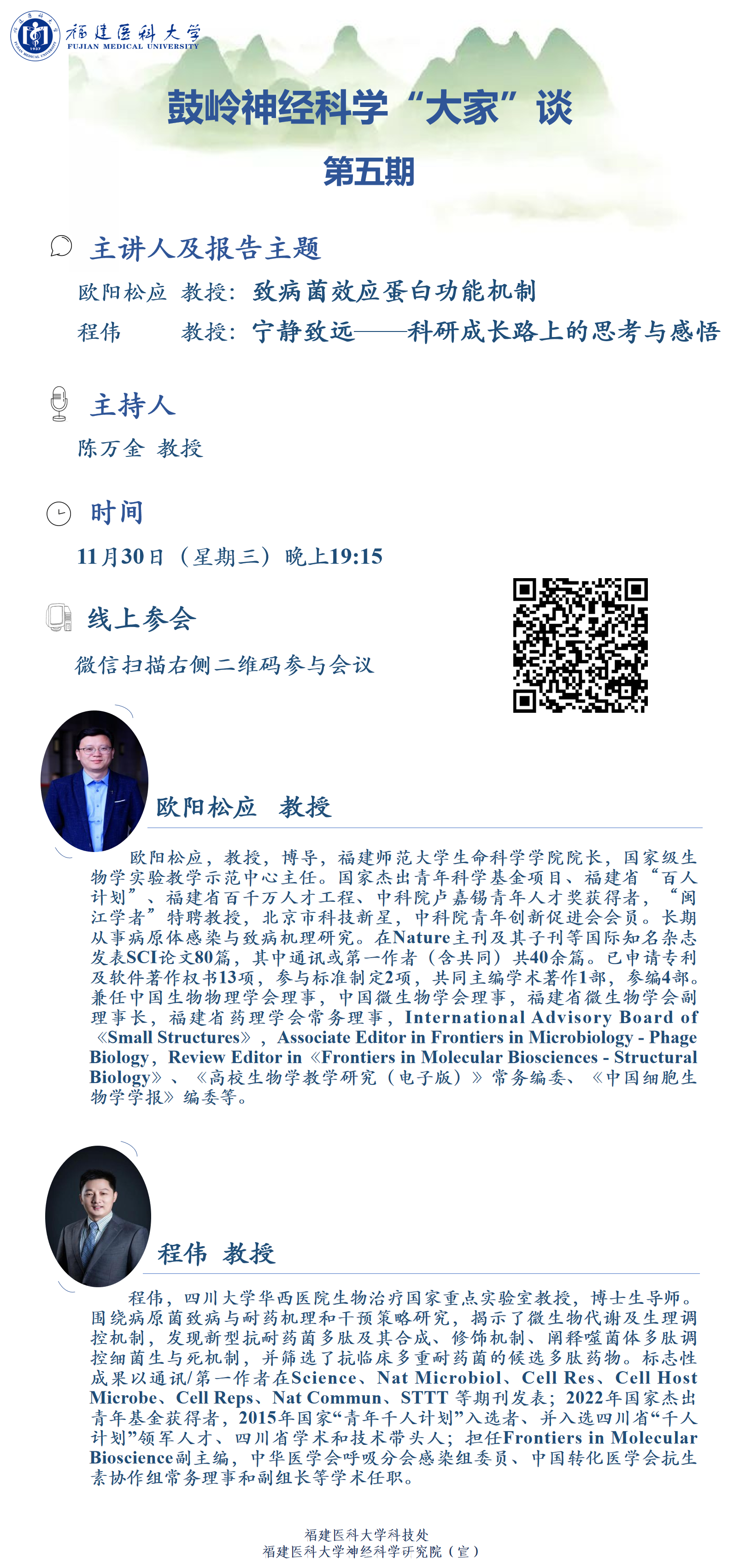 为了进一步提升米兰的学术声誉和学科知名度,加强国际和国内同行间的交流与合作,同时以神经科学带动多学科协同发展,共同加快推进米兰的“双一流”建设。米兰采取“请进来”“走出去”相结合的模式,举办鼓岭神经科学“大家”谈系列学术讲座,定期邀请国内外知名专家以及本校学者开展高水平学术讲座。第五期我们邀请了福建师范大学欧阳松应教授和四川大学华西医院程伟教授于2022年11月30日举办讲座,欢迎大家积极参会!