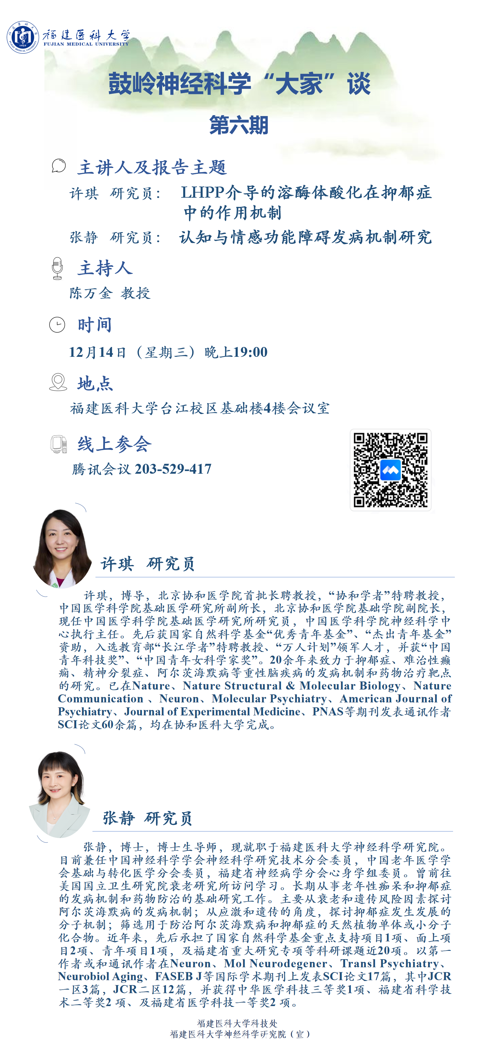为了进一步提升米兰的学术声誉和学科知名度,加强国际和国内同行间的交流与合作,同时以神经科学带动多学科协同发展,共同加快推进米兰的“双一流”建设。米兰采取“请进来”“走出去”相结合的模式,举办鼓岭神经科学“大家”谈系列学术讲座,定期邀请国内外知名专家以及本校学者开展高水平学术讲座。第六期我们邀请了中国医学科学院许琪研究员和米兰milan官方网站张静研究员于2022年12月14日举办讲座,欢迎大家积极参会!