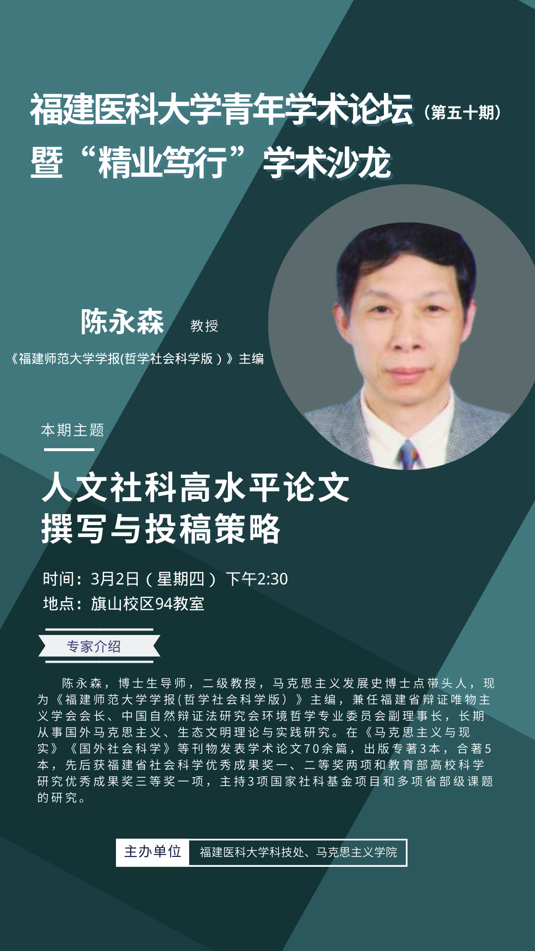 陈永森,博士生导师,二级教授,马克思主义发展史博士点带头人,现为《福建师范大学学报(哲学社会科学版)》主编,兼任福建省辩证唯物主义学会会长、中国自然辩证法研究会环境哲学专业委员会副理事长,长期从事国外马克思主义、生态文明理论与实践研究。在《马克思主义与现实》《国外社会科学》等刊物发表学术论文70余篇,出版专著3本,合著5本,先后获福建省社会科学优秀成果奖一、二等奖两项和教育部高校科学研究优秀成果奖三等奖一项,主持3项国家社科基金项目和多项省部级课题的研究。