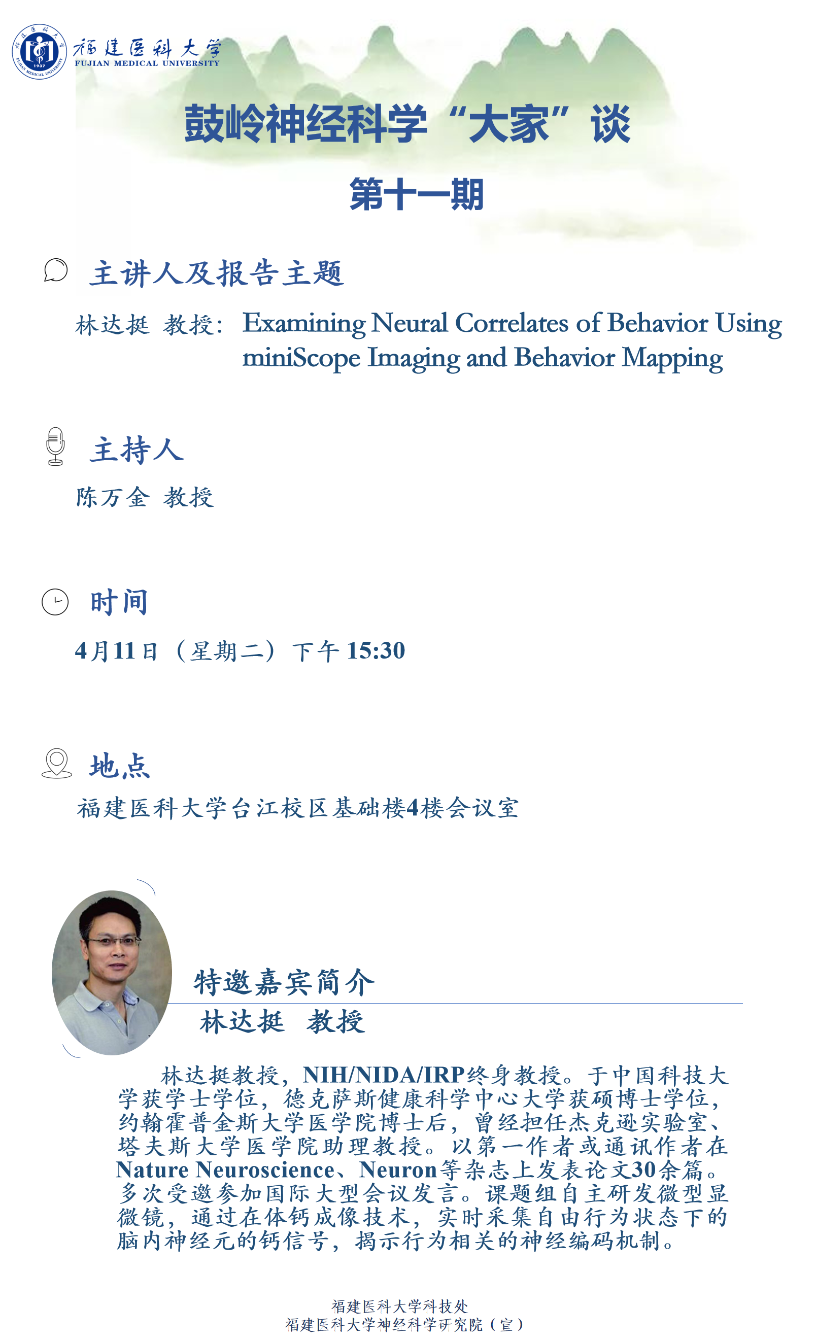 为了进一步提升米兰的学术声誉和学科知名度,加强国际和国内同行间的交流与合作,同时以神经科学带动多学科协同发展,共同加快推进米兰的“双一流”建设。米兰采取“请进来”“走出去”相结合的模式,举办鼓岭神经科学“大家”谈系列学术讲座,定期邀请国内外知名专家以及本校学者开展高水平学术讲座。第十一期我们邀请了NIH/NIDA/IRP终身教授林达挺教授于2023年4月11日举办讲座,欢迎大家积极参会!