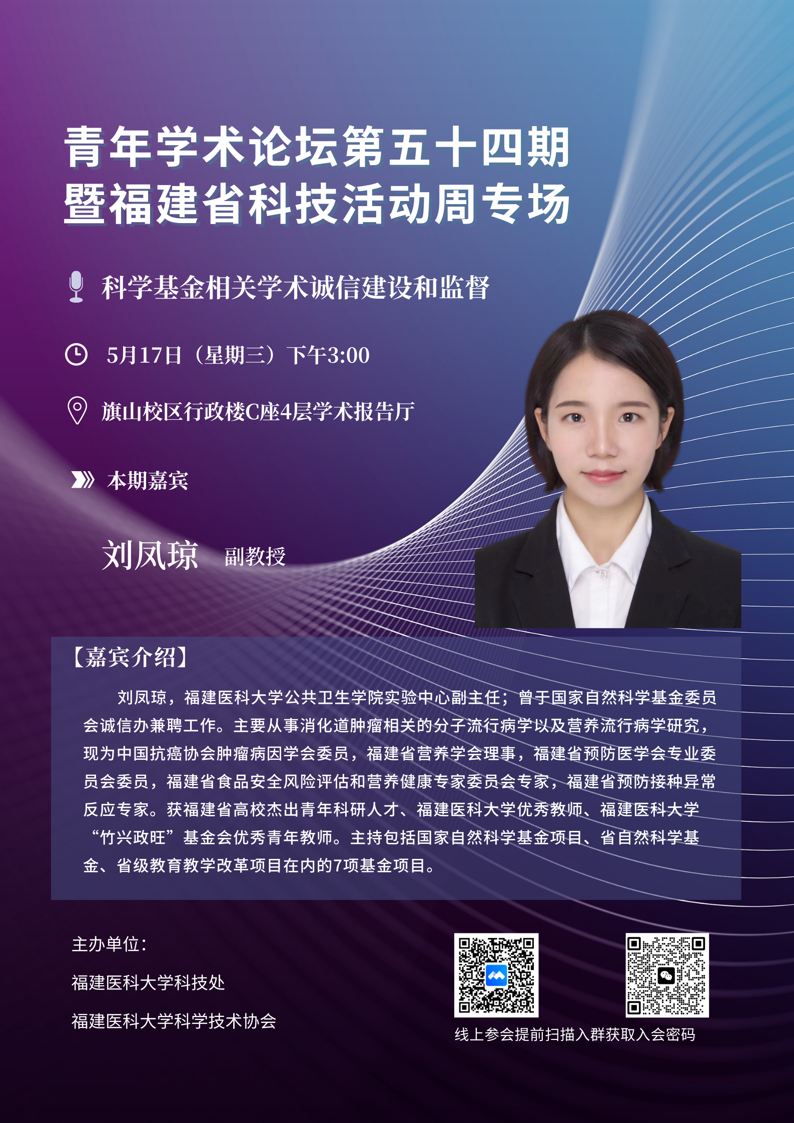 各单位科管人员及近3年入职青年科研人员需线下参会,请于5月16日下班前将参会人员名单发送至fmuzhk@fjmu.edu.cn。