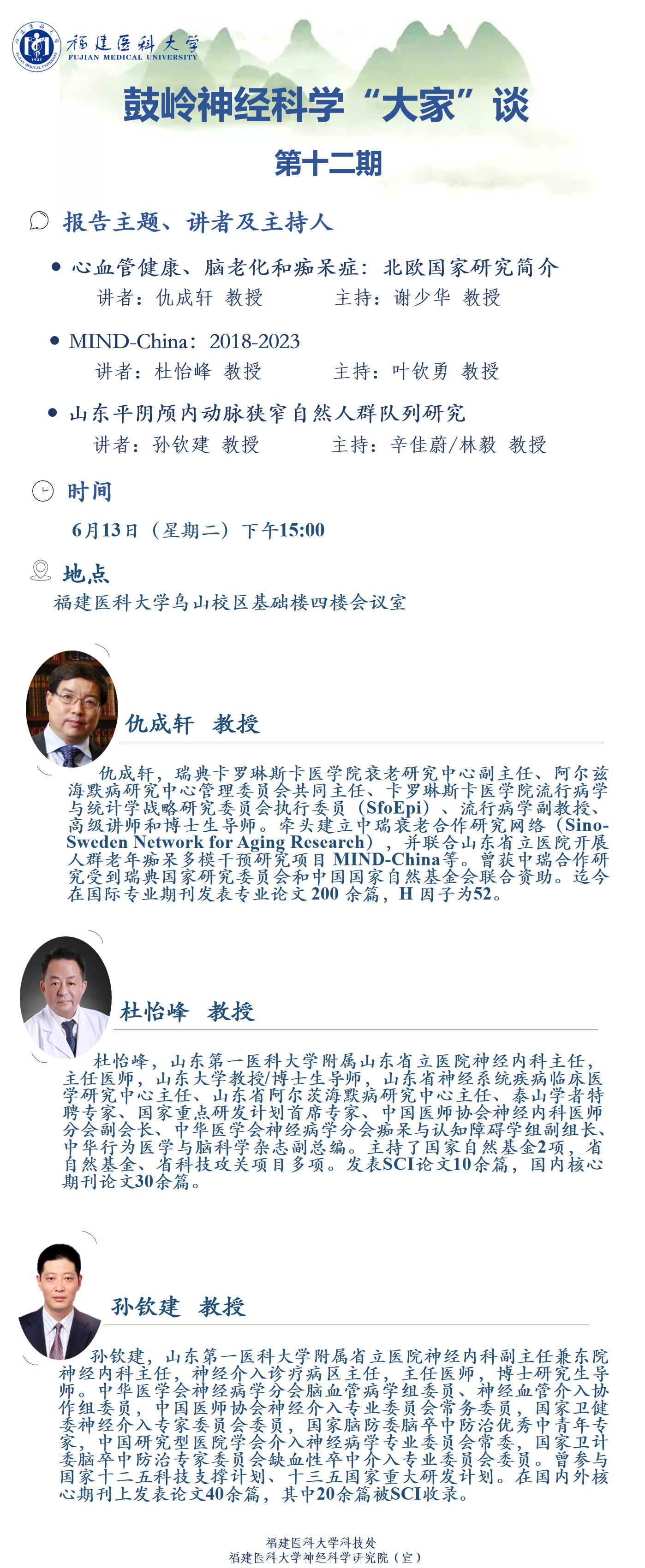 为了进一步提升米兰的学术声誉和学科知名度,加强国际和国内同行间的交流与合作,同时以神经科学带动多学科协同发展,共同加快推进米兰的“双一流”建设。于2023年6月13日举办鼓岭神经科学“大家”谈(第十二期)的学术讲座,特邀请国内外知名专家瑞典卡罗琳斯卡医学院仇成轩教授、山东省立医院杜怡峰教授和孙钦建教授以及本校学者进行学术交流及指导。欢迎大家积极参会!
