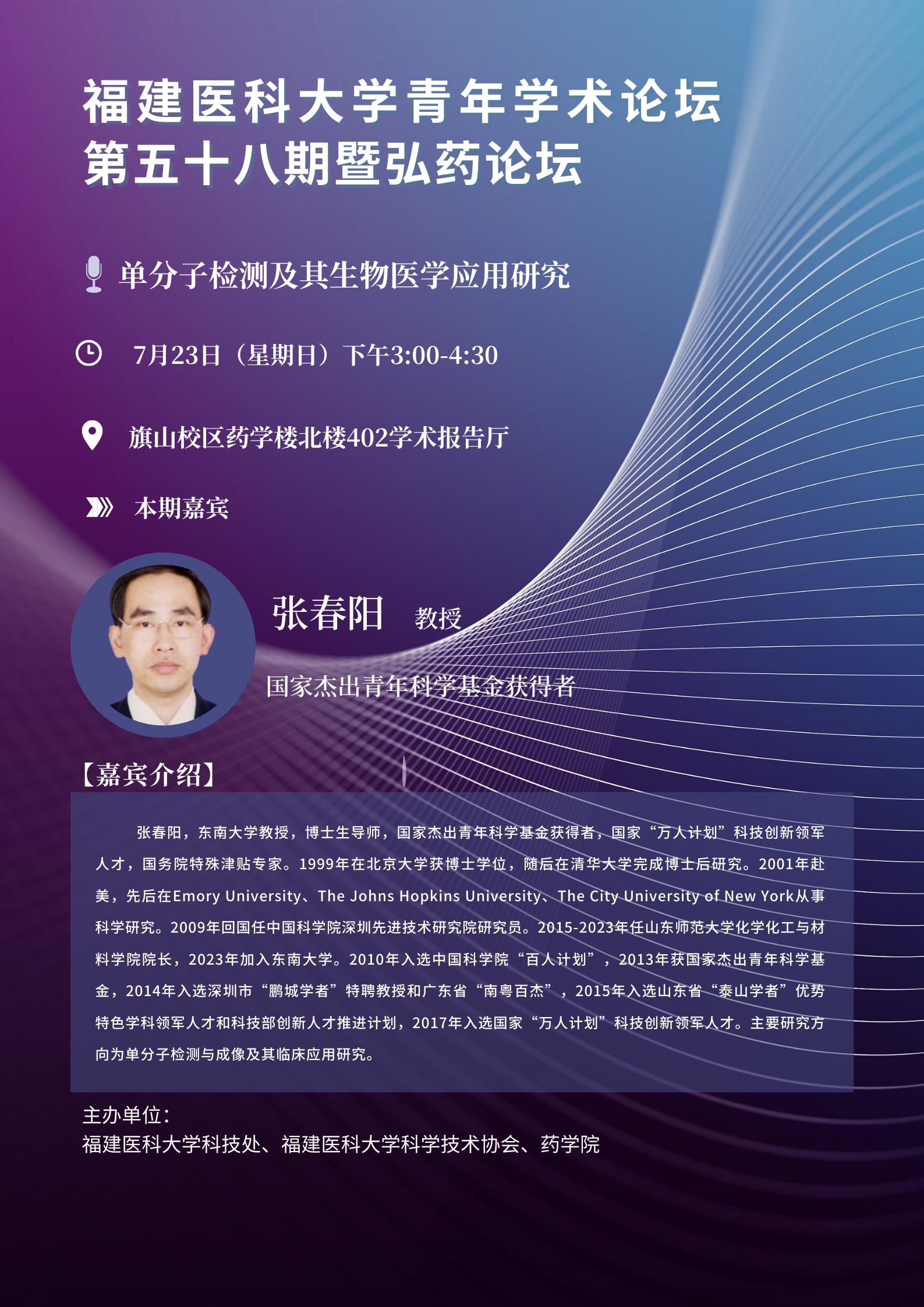 张春阳,东南大学教授,博士生导师,国家杰出青年科学基金获得者,国家“万人计划”科技创新领军人才,国务院特殊津贴专家。1999年在北京大学获博士学位,随后在清华大学完成博士后研究。2001年赴美,先后在Emory University、The Johns Hopkins University、The City University of New York从事科学研究。2009年回国任中国科学院深圳先进技术研究院研究员。2015-2023年任山东师范大学化学化工与材料学院院长,2023年加入东南大学。2010年入选中国科学院“百人计划”,2013年获国家杰出青年科学基金,2014年入选深圳市“鹏城学者”特聘教授和广东省“南粤百杰”,2015年入选山东省“泰山学者”优势特色学科领军人才和科技部创新人才推进计划,2017年入选国家“万人计划”科技创新领军人才。主要研究方向为单分子检测与成像及其临床应用研究。