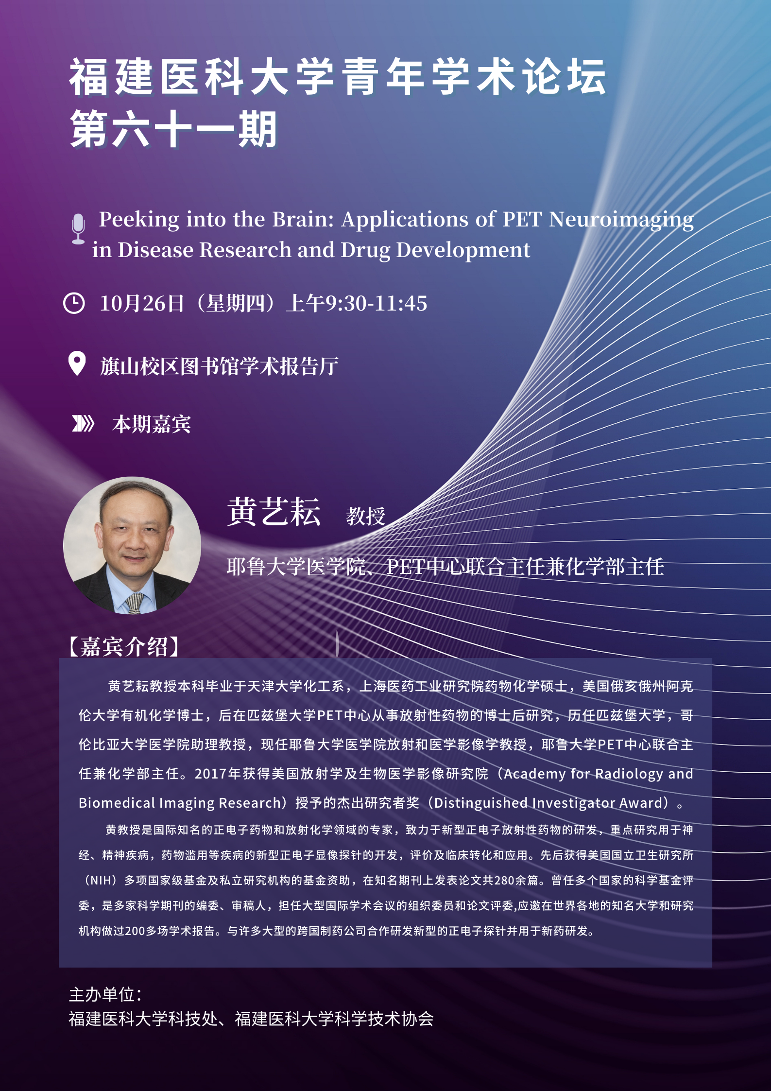 黄艺耘教授本科毕业于天津大学化工系,上海医药工业研究院药物化学硕士,美国俄亥俄州阿克伦大学有机化学博士,后在匹兹堡大学PET中心从事放射性药物的博士后研究,历任匹兹堡大学,哥伦比亚大学医学院助理教授,现任耶鲁大学医学院放射和医学影像学教授,耶鲁大学PET中心联合主任兼化学部主任。2017年获得美国放射学及生物医学影像研究院(Academy for Radiology and Biomedical Imaging Research)授予的杰出研究者奖(Distinguished Investigator Award)。