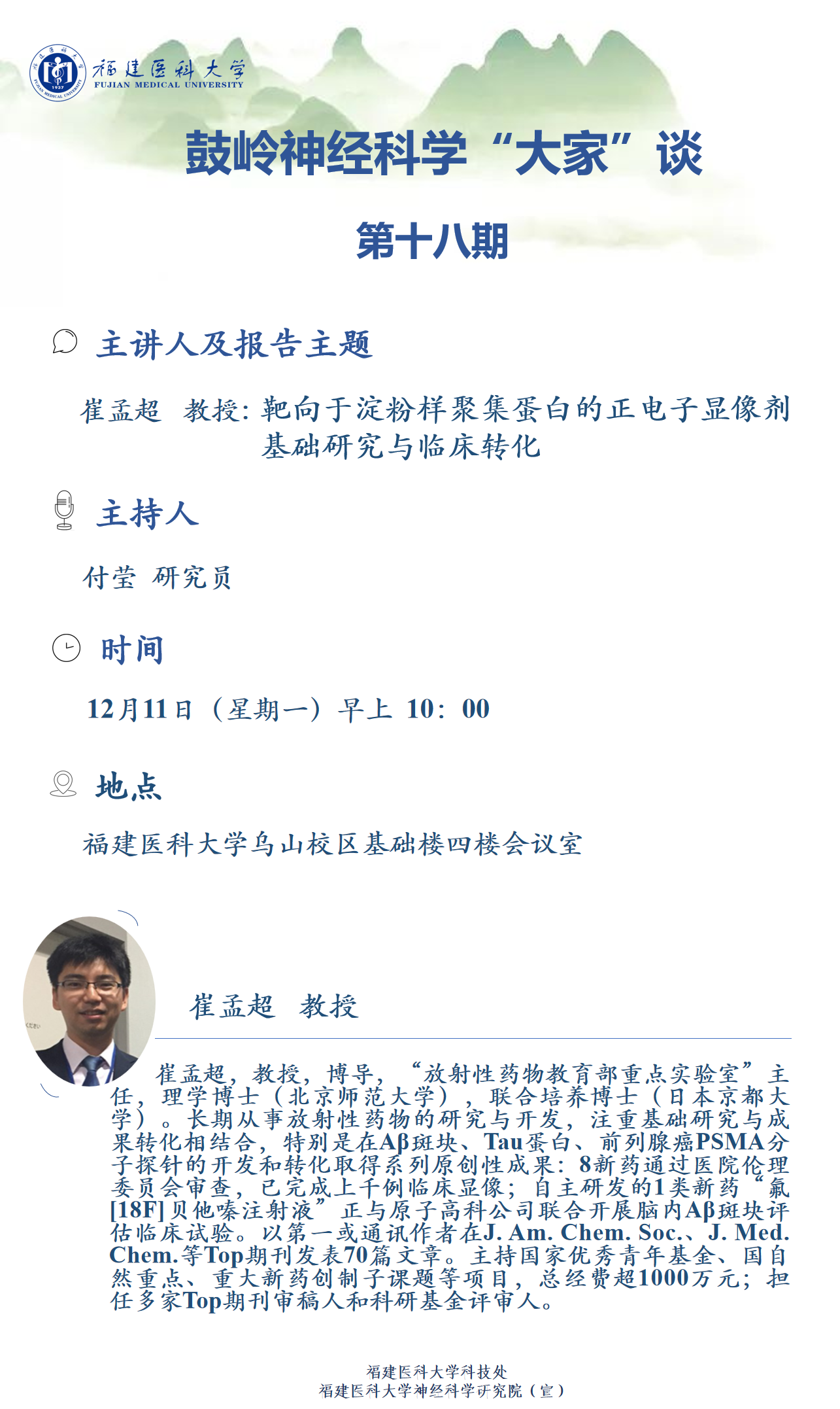 讲座主题:靶向于淀粉样聚集蛋白的正电子显像剂基础研究与临床转化(崔孟超教授)