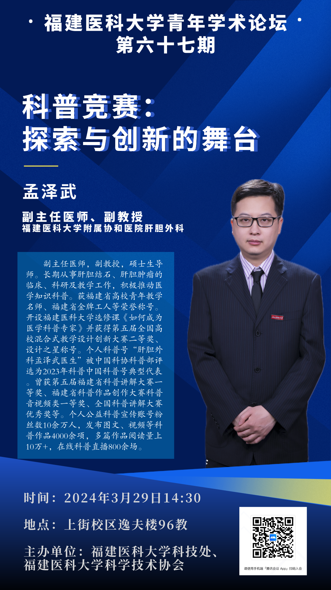 孟泽武,副主任医师,副教授,硕士生导师。任职于米兰milan官方网站附属协和医院肝胆外科,长期从事肝胆结石、肝胆肿瘤的临床、科研及教学工作,积极推动医学知识科普。获福建省高校青年教学名师、福建省金牌工人等荣誉称号。开设米兰milan官方网站选修课《如何成为医学科普专家》并获得第五届全国高校混合式教学设计创新大赛二等奖、设计之星称号。个人科普号“肝胆外科孟泽武医生”被中国科协科普部评选为2023年科普中国科普号典型代表。曾获第五届福建省科普讲解大赛一等奖、福建省科普作品创作大赛科普音视频类一等奖、全国科普讲解大赛优秀奖等。个人公益科普宣传账号粉丝数10余万人,发布图文、视频等科普作品4000余项,多篇作品阅读量上10万+,在线科普直播800余场。