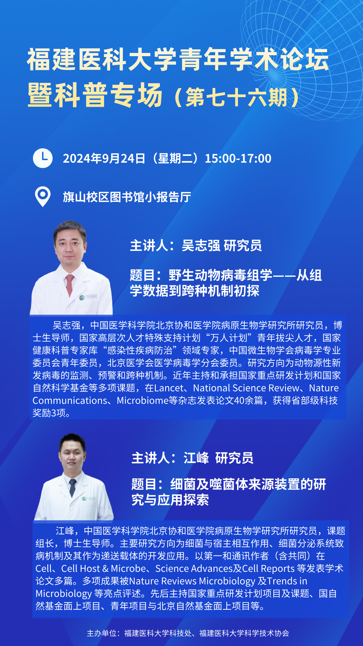 15:00-16:00 | 吴志强研究员(中国医学科学院北京协和医学院病原生物学研究所) | 野生动物病毒组学——从组学数据到跨种机制初探 |