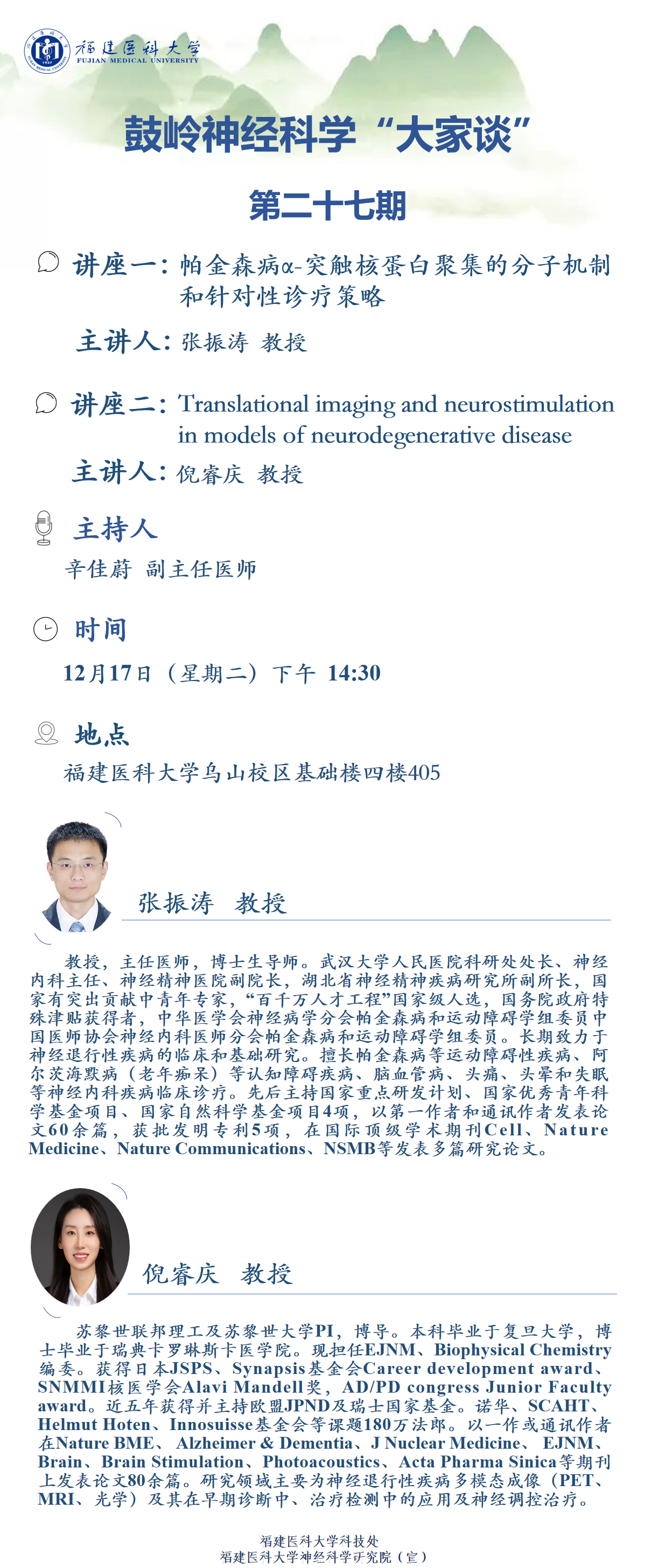 讲座主题:帕金森病α-突触核蛋白聚集的分子机制和针对性诊疗策略