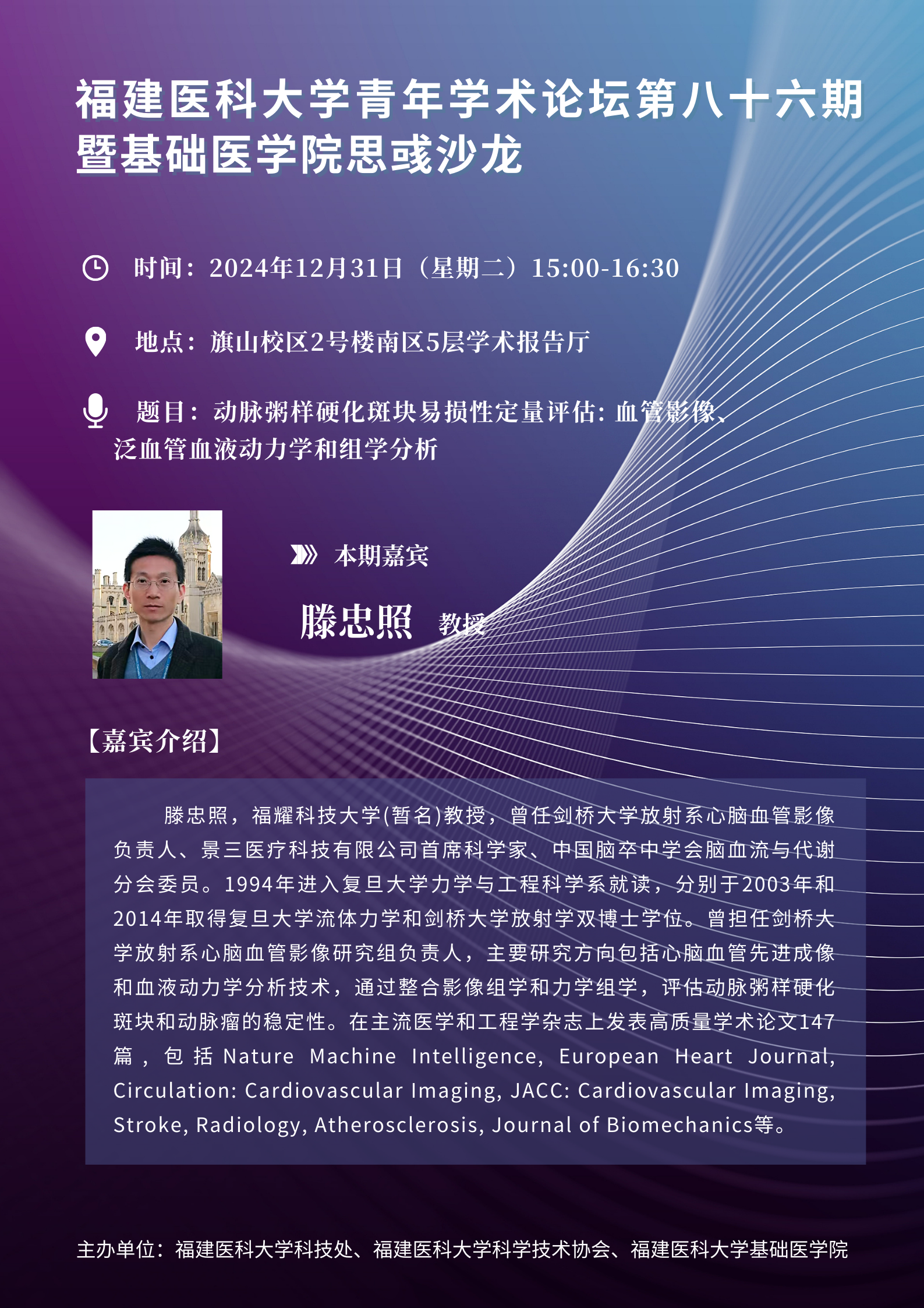滕忠照,福耀科技大学(暂名)教授,曾任剑桥大学放射系心脑血管影像负责人、景三医疗科技有限公司首席科学家、中国脑卒中学会脑血流与代谢分会委员。1994年进入复旦大学力学与工程科学系就读,分别于2003年和2014年取得复旦大学流体力学和剑桥大学放射学双博士学位。曾担任剑桥大学放射系心脑血管影像研究组负责人,主要研究方向包括心脑血管先进成像和血液动力学分析技术,通过整合影像组学和力学组学,评估动脉粥样硬化斑块和动脉瘤的稳定性。在主流医学和工程学杂志上发表高质量学术论文147篇, 包括Nature Machine Intelligence, European Heart Journal, Circulation: Cardiovascular Imaging, JACC: Cardiovascular Imaging, Stroke, Radiology, Atherosclerosis, Journal of Biomechanics等。