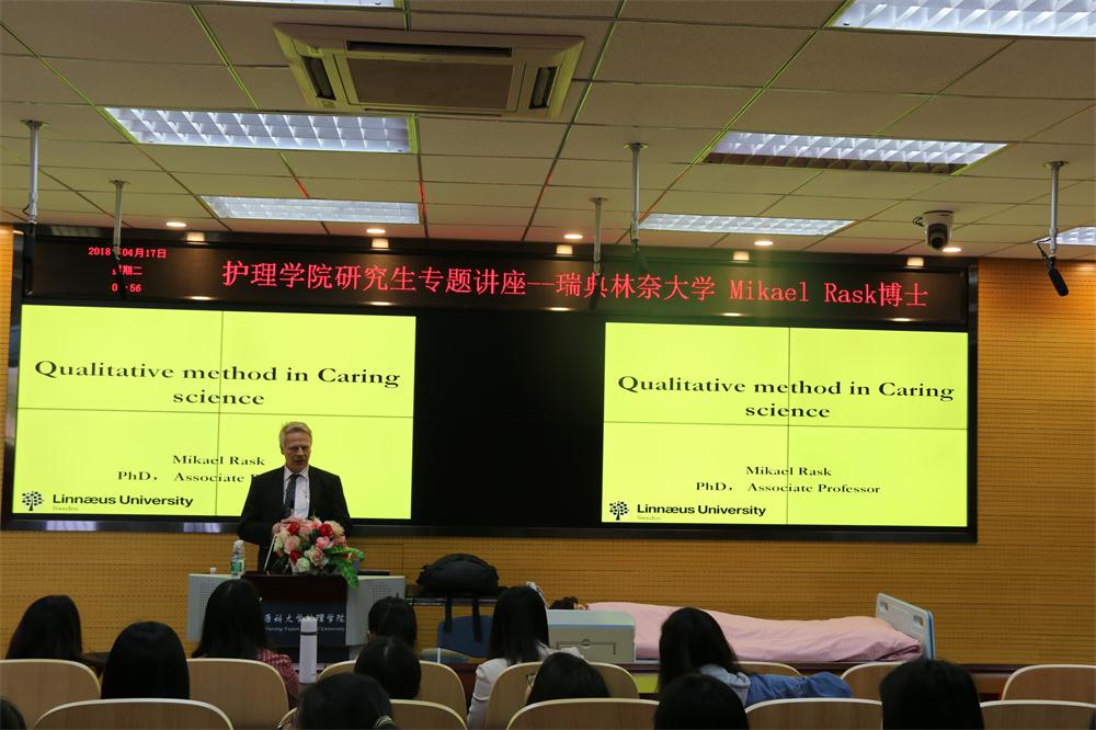 2018年4月16-17日,米兰客座教授、瑞典林奈大学健康照护学系Mikael Rask博士来校讲学。期间,Mikael Rask教授为2016级护理本科生讲授《精神科护理中的护患关系》,并为护理学专业研究生做了护理质性研究的专题讲座。Mikael Rask教授结合自身工作经验,为同学们进行了别开生面的授课,既开拓了学生视野,也为教师教学能力提升做了一个良好的示范,受到师生们的一致好评。