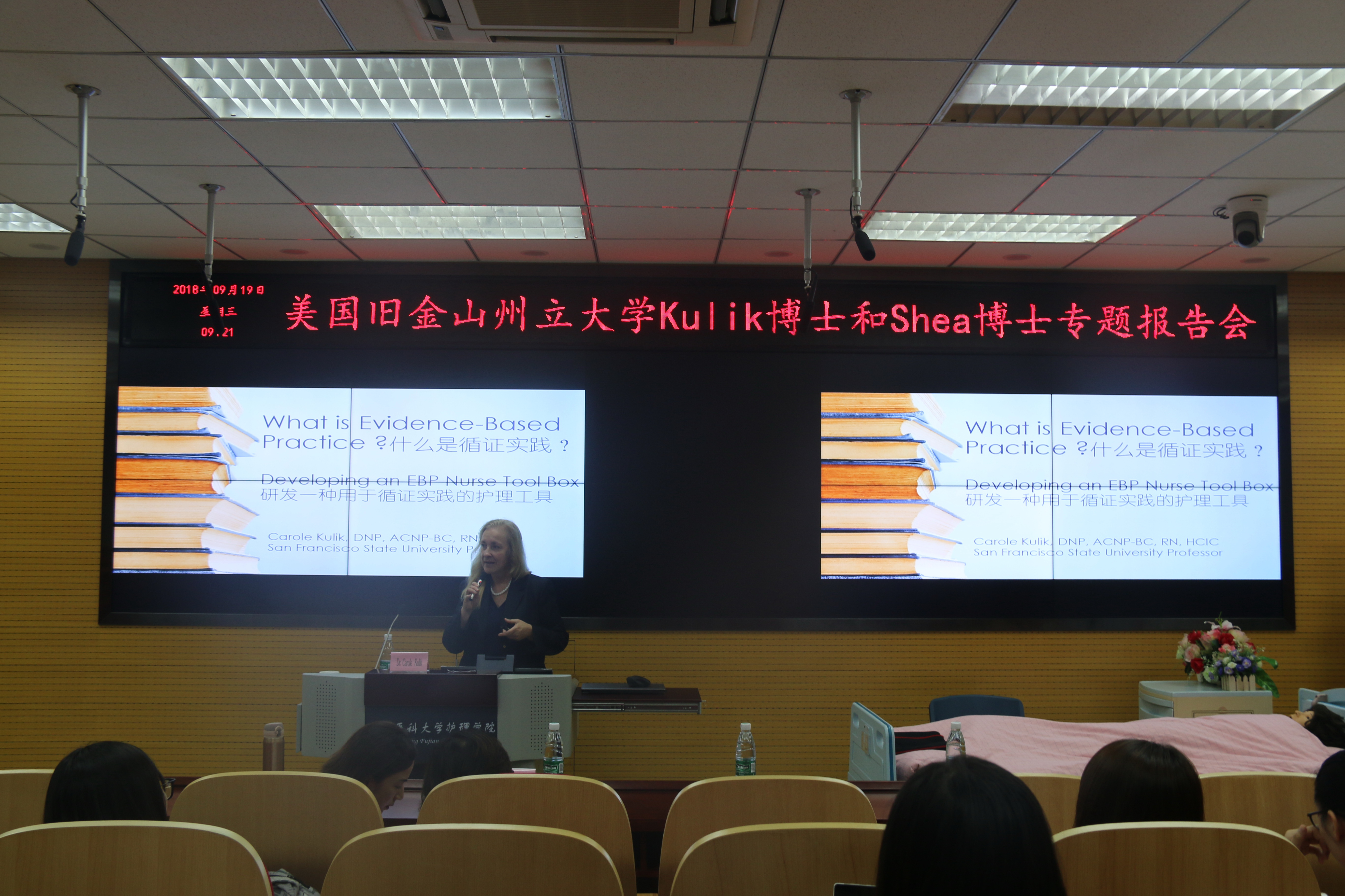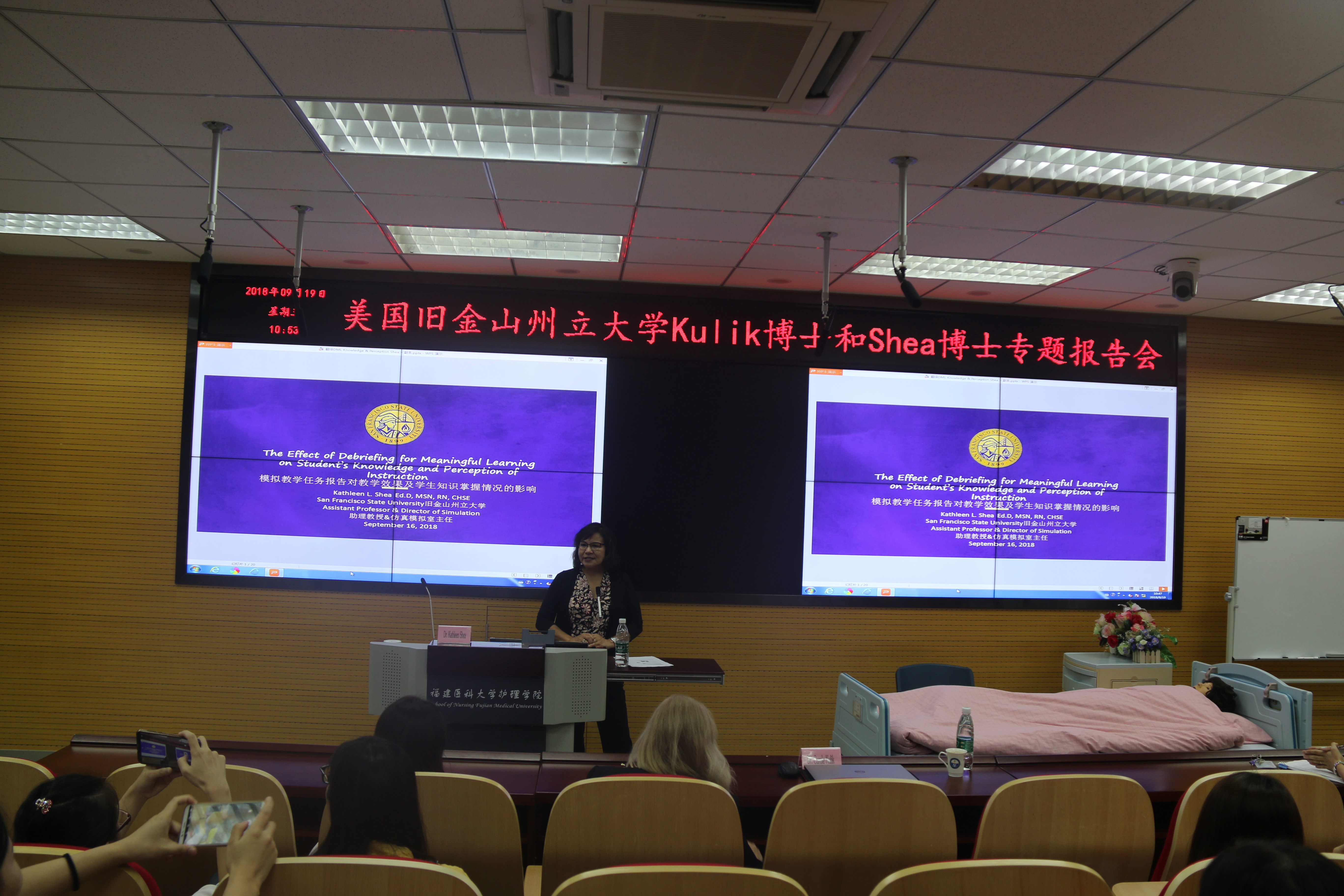 美国旧金山州立大学Carole Kulik博士和Kathleen Shea博士应邀于9月19日到访护理学院,两位专家分别做了题为《循证护理的概述及工具应用》和《模拟教学任务报告对教学效果及学生知识掌握情况的影响》的专题讲座,学院教师及研究生近70人聆听了讲座,并积极参与研讨,专家们耐心答疑解惑,为师生们带去前沿的国际护理知识分享,随后两位专家参观了国家级护理学实验教学中心和校史馆。此外,两位专家还与米兰港澳台办、学院领导商讨进一步学术交流与合作事宜。