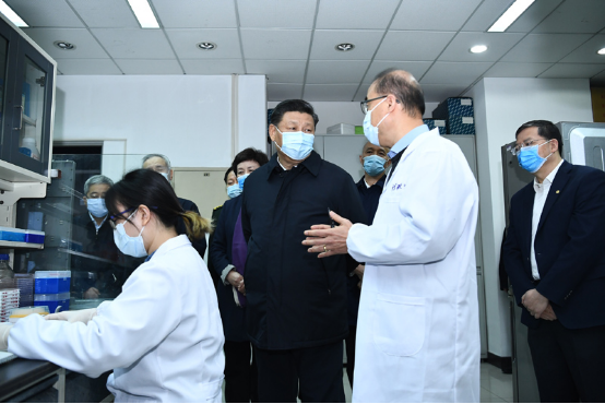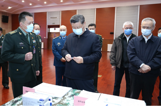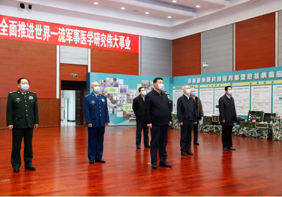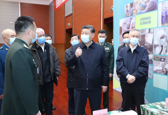 2日下午,习近平首先来到军事医学研究院,听取研究院关于新冠肺炎疫情防控科研攻关的总体情况汇报,结合展板和实物了解疫苗和抗体研制、药物筛选、病毒致病机理研究、快速检测试剂研究和应用等进展情况。在仪器测试楼,习近平察看了重大疫情应急防控药物研究室,向坚守岗位、奋力攻关的一线专家和科研人员表示亲切慰问。他强调,提高治愈率、降低病亡率,最终战胜疫情,关键要靠科技。习近平指出,新冠肺炎疫情发生以来,军事医学研究院坚决贯彻党中央和中央军委决策指示,闻令即动、争分夺秒,集中力量展开应急科研攻关,取得了阶段性成果,充分展现了人民军队忠于党、忠于人民的政治本色和敢打硬仗、善打胜仗的优良作风。习近平希望他们再接再厉,充分发挥突击队和主力军作用,尽快研制出安全有效的疫苗、药物、检测试剂,全力满足抗击疫情需要。要坚持在疫情可溯、可诊、可防、可治、可控方面合力攻关,通过打这场硬仗,掌握更多具有自主知识产权的核心科技,拿出更多硬核产品,为维护人民生命安全和身体健康、维护国家战略安全作出更大贡献。