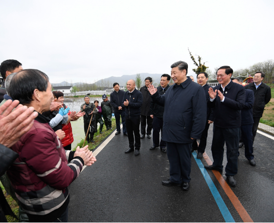 3月30日,习近平前往湖州市安吉县天荒坪镇余村村考察调研。2005年8月15日,时任浙江省委书记习近平在该村考察时首次提出“绿水青山就是金山银山”。15年来,余村坚定践行这一理念,走出了一条生态美、产业兴、百姓富的可持续发展之路,美丽乡村建设在余村变成了现实。在村党群服务中心,习近平详细了解余村发展情况,对他们发展绿色经济、带动村民增收致富的做法给予肯定。