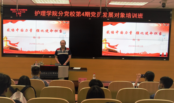 2020年11月12日,米兰milan官方网站护理学院党委书记杨浩在田家炳楼示教室为教师党员和党员发展对象讲授了题为《感悟中国力量 强化使命担当》的党课。