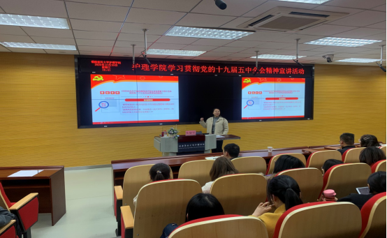 2020年12月30日晚上18:30,护理学院在田家炳楼会议室举办党的十九届五中全会宣讲活动,校学生工作部部长张敏坚做了题为《在学思践悟中坚定理想信念在奋发有为中践行初心使命》的辅导报告,学院学生工作办公室老师和100名学生代表参加了宣讲会。