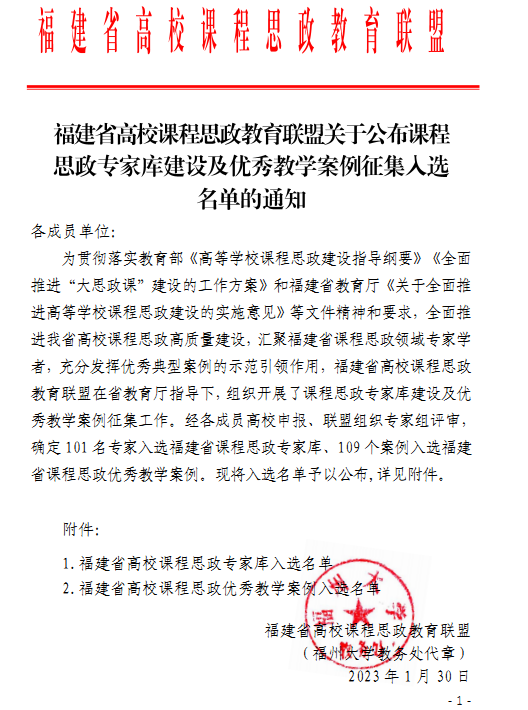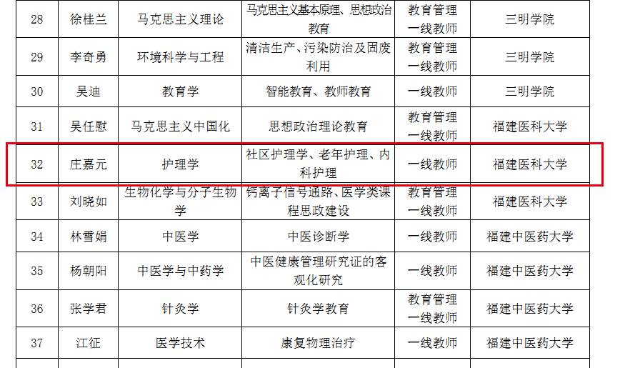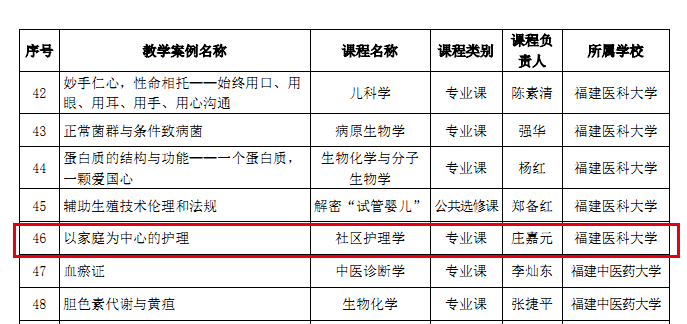 继获评福建省课程思政示范课程后,我院“社区护理学”团队再创佳绩,课程负责人庄嘉元教授入选福建省高校课程思政专家库专家,教学案例“以家庭为中心的护理”入选福建省高校课程思政优秀教学案例。