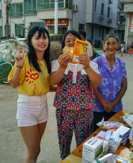 活动当天,当地的气温高达35摄氏度,队员们在烈日下活动,热情却不减。活动伊始,队员们在当地村委会和百姓的帮助下,布置好了义诊和游戏的场地。随后,志愿者们摆放好了爱心药品,分配好了各自的任务后,静心地等待着村民的到来。活动中,由队长坐诊,为路过的或闻讯而来的村民免费测量血压。同时,义诊的旁边还设有“套圈送文具”的小游戏以及面向老人家的“脊椎健康操”的学习,为单调的义诊活动增添了一丝色彩。参与学习的村民还可以获得免费爱心药品。活动结束后,队员们清理了现场,给村民们留下了好印象。