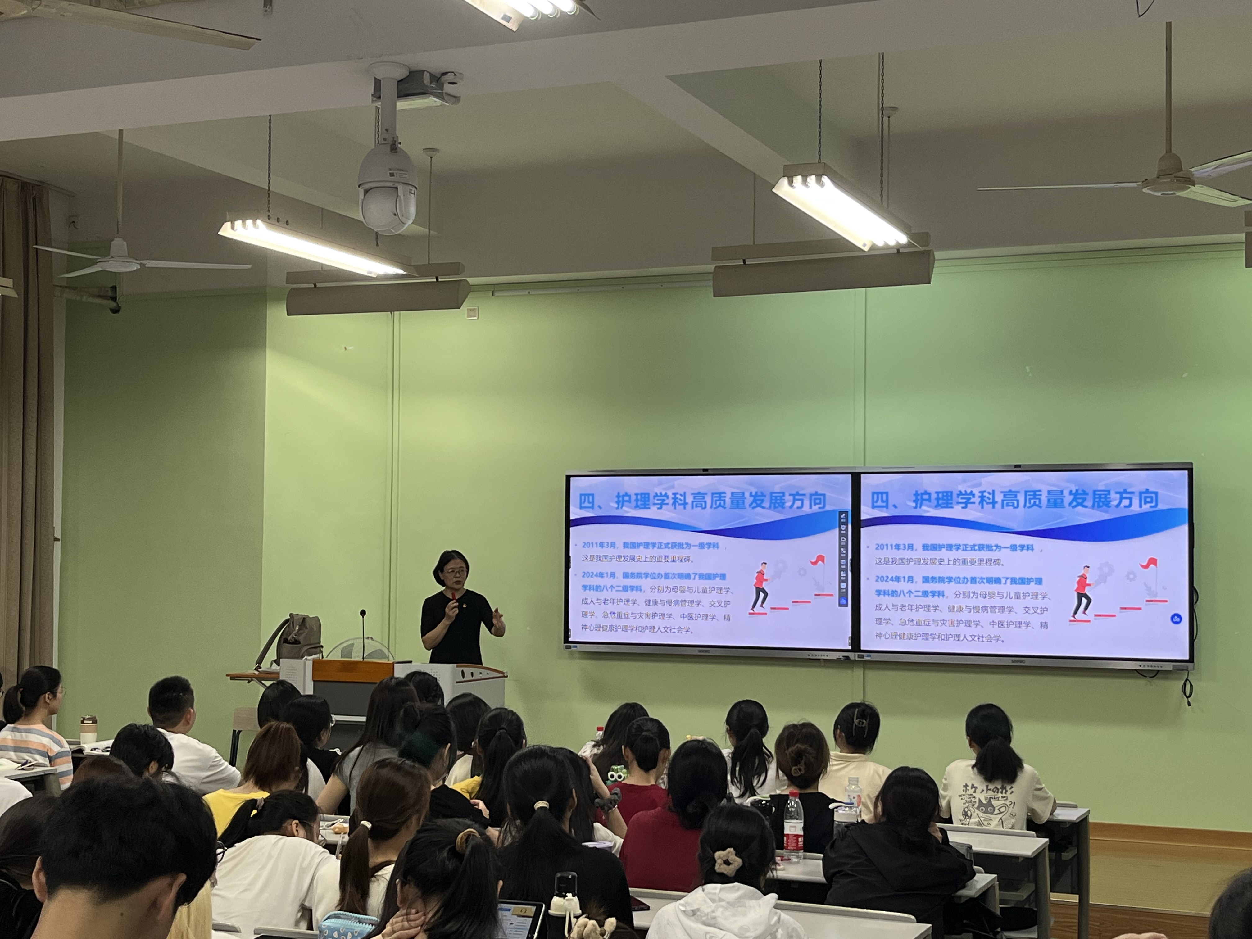李红围绕科技创新的重要性世界科技竞争现状我国科技机遇与挑战和护理学科高质量发展等方面进行具体阐述,用生动事迹为大家讲解科技创新是发展新质生产力的核心要素,激发学生积极思考在新的时代背景下如何奋发有为,实现自我和社会价值的融合发展。李红结合学生专业方向,以时间为线,梳理护理学科发展脉络,指出护理学科高质量发展的五个方向,即一是实现人文与科学统一的学科精神,二是发展中国特色的护理学科理论体系,三是构建护理亚专业学科体系,四是培养符合社会需求的护理专业人才,五是加强护理信息化建设。