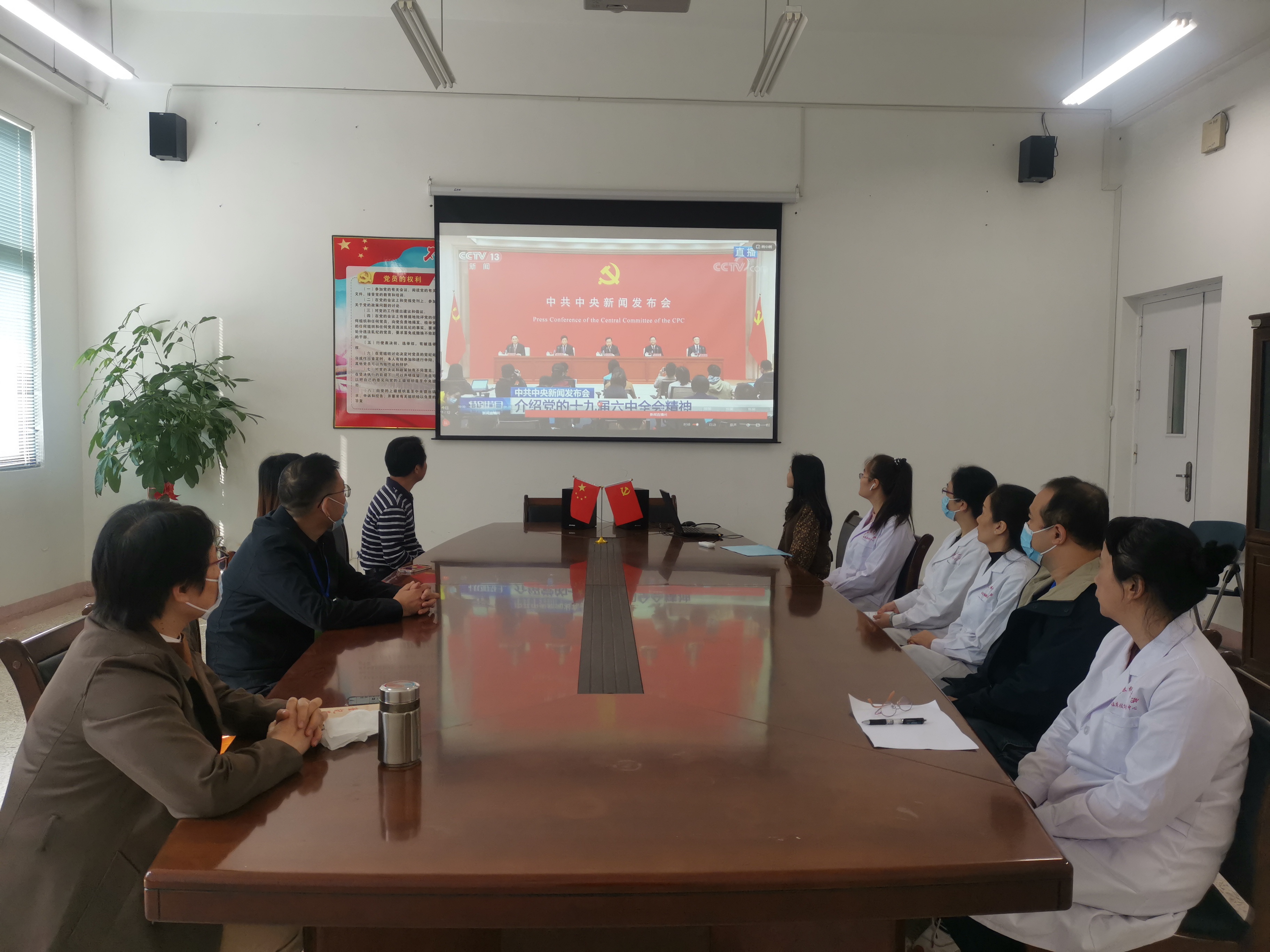 11月12日上午10:00,临床技能教学中心党支部组织中心全体教职工在会议室收看《中共中央关于党的十九届六中全会精神新闻发布会》直播。