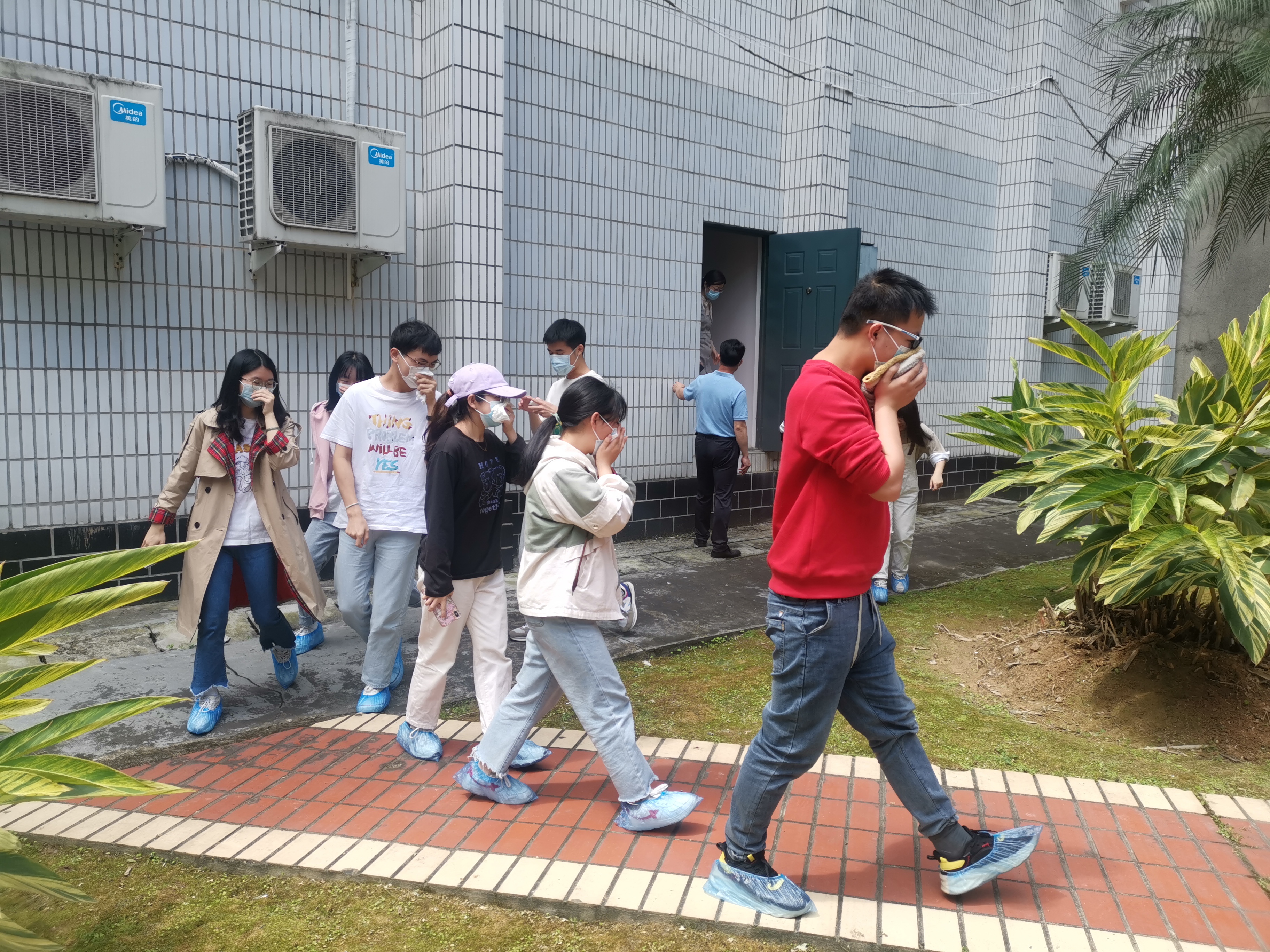 本次应急疏散演练模拟实验室机房空调漏水导致设备短路引发火灾的情景。消防警报响起,中心教职工及任课教师立即引导学生用湿毛巾捂住口鼻,弯腰扶墙,按疏散路线有序撤离至实验室外安全区域。实验室管理人员将“火灾情况”上报学校保卫处并拨打119。任课教师在学生到达安全区域后立即清点逃生人数,并及时向有关部门汇报,随后师生合力使用干粉灭火器扑灭初起火灾。