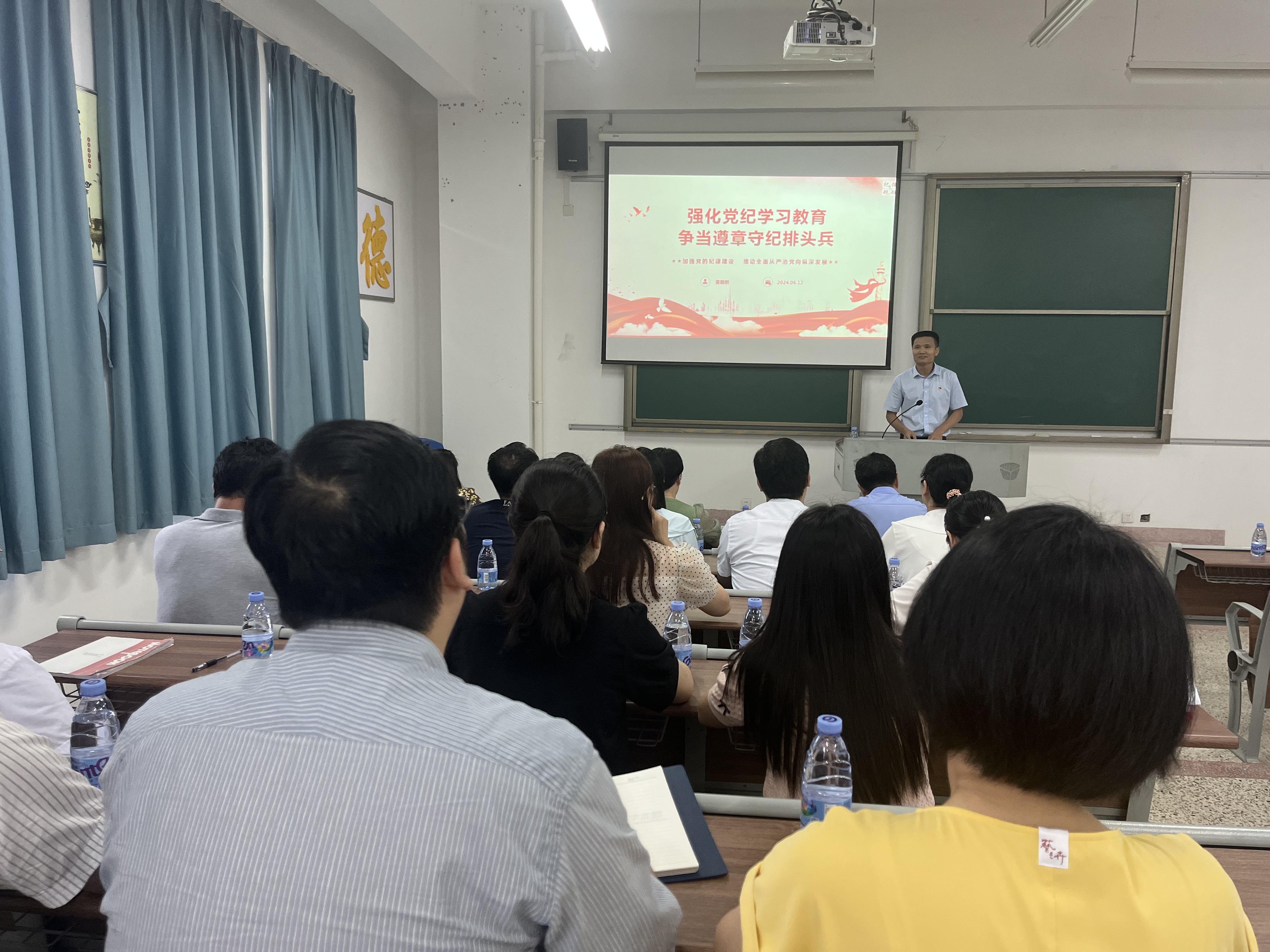 资产管理处党支部黄朝新书记以《强化党纪学习教育争当遵章守纪排头兵》为题上党课,系统阐述了党持之以恒进行纪律建设的创新探索,并紧密联系学校工作实际,结合典型案例,以案为鉴、以案示警、以案明纪、以案促学。中心党支部黄海辉书记指出,党的纪律建设是中国共产党进行自我革命的重要举措,是提高党的组织力、凝聚力和战斗力的必然要求,全体党员应切实把思想和行动统一到习近平总书记重要论述和党中央决策部署上来,坚决拥护“两个确立”、做到“两个维护”,认真扎实开展党纪学习教育,主动自觉学纪、知纪、明纪、守纪,始终做到对党绝对忠诚、绝对纯洁、绝对可靠。