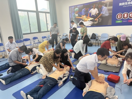 党纪学习专题教育结束后,中心党员代表曾爱英老师为全体党员带来了一场生动的急救知识讲座,向参加活动的师生党员详细讲解了心肺复苏术和AED的使用方法,就如何把握好心脏骤停后的黄金4分钟进行了具体教学。参加活动的师生党员积极利用模拟人进行急救演练。中心党员代表彭小蕊、宋维两位老师针对心肺复苏术和AED除颤仪的使用进行手把手教学,并进行细致的操作指导,活动现场气氛活跃。
