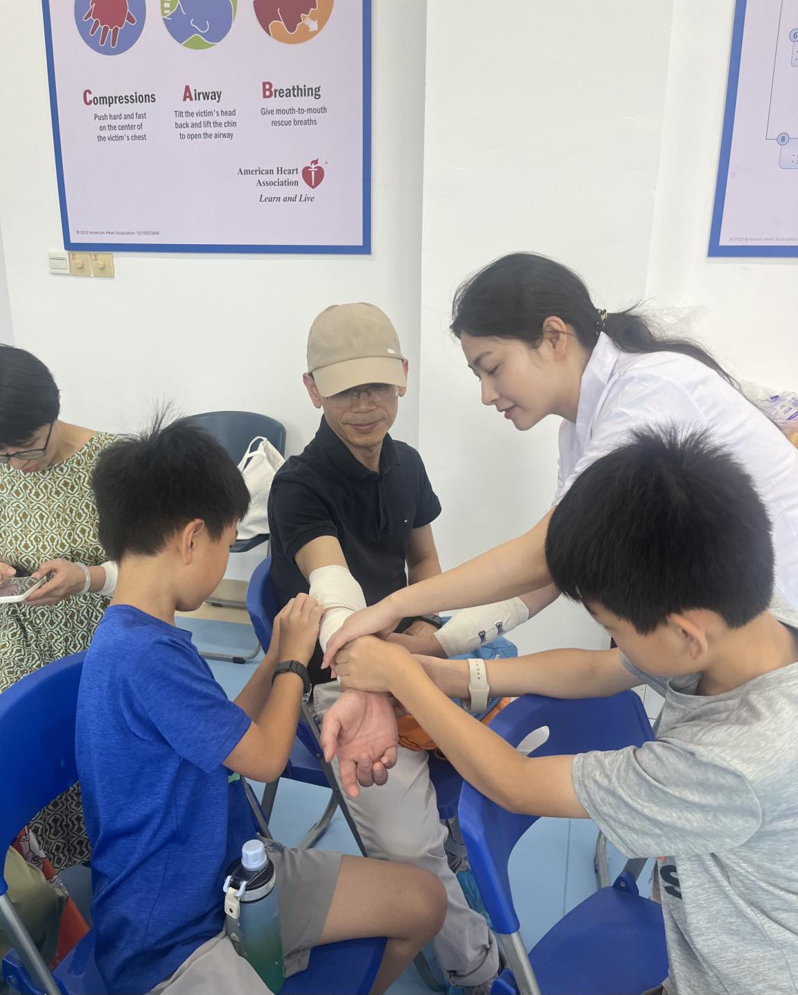 活动伊始,“伤口仿妆”环节便迅速点燃孩子们的好奇心。中心老师携带专业仿妆工具现场教学,在孩子们的额头、手掌、手臂上勾勒出逼真伤口,部分还细致呈现出淤青肿胀效果,仿佛真实意外场景再现,让孩子们快速进入学习状态。紧接着的实操环节中,孩子们分组练习止血、包扎与固定技术,在团队协作中深化了对急救流程的理解。