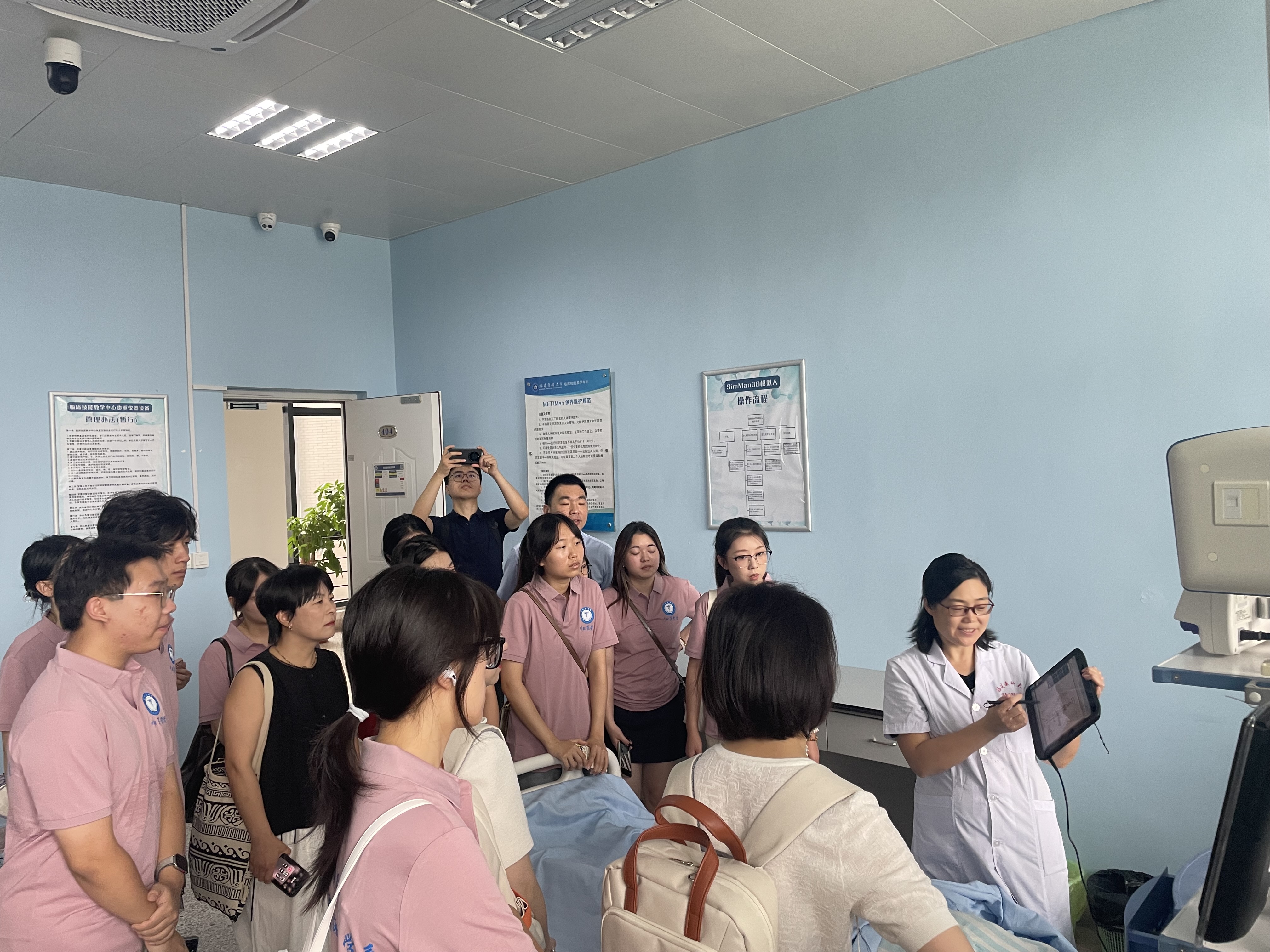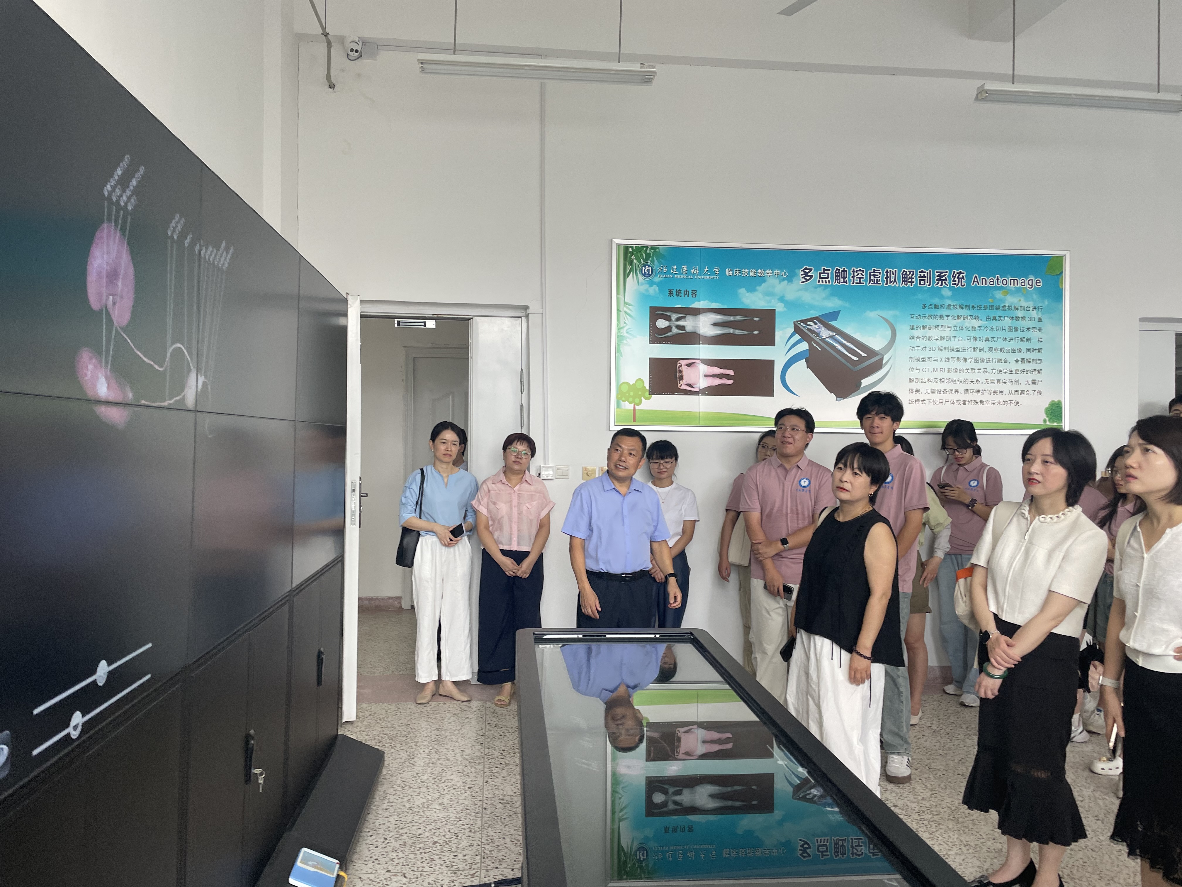 中心副主任黄海辉向来宾介绍了中心概况、国家级医考基地和省级实验教学示范中心及桥梁课程的建设成果。随后,参访团一行实地参观外科学基础和诊断学实验室、虚拟腔镜实验室、生命支持技能训练基地和麻醉专业实验室,深入了解中心教学实践。