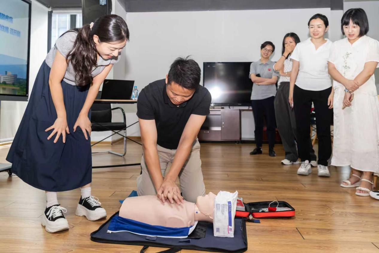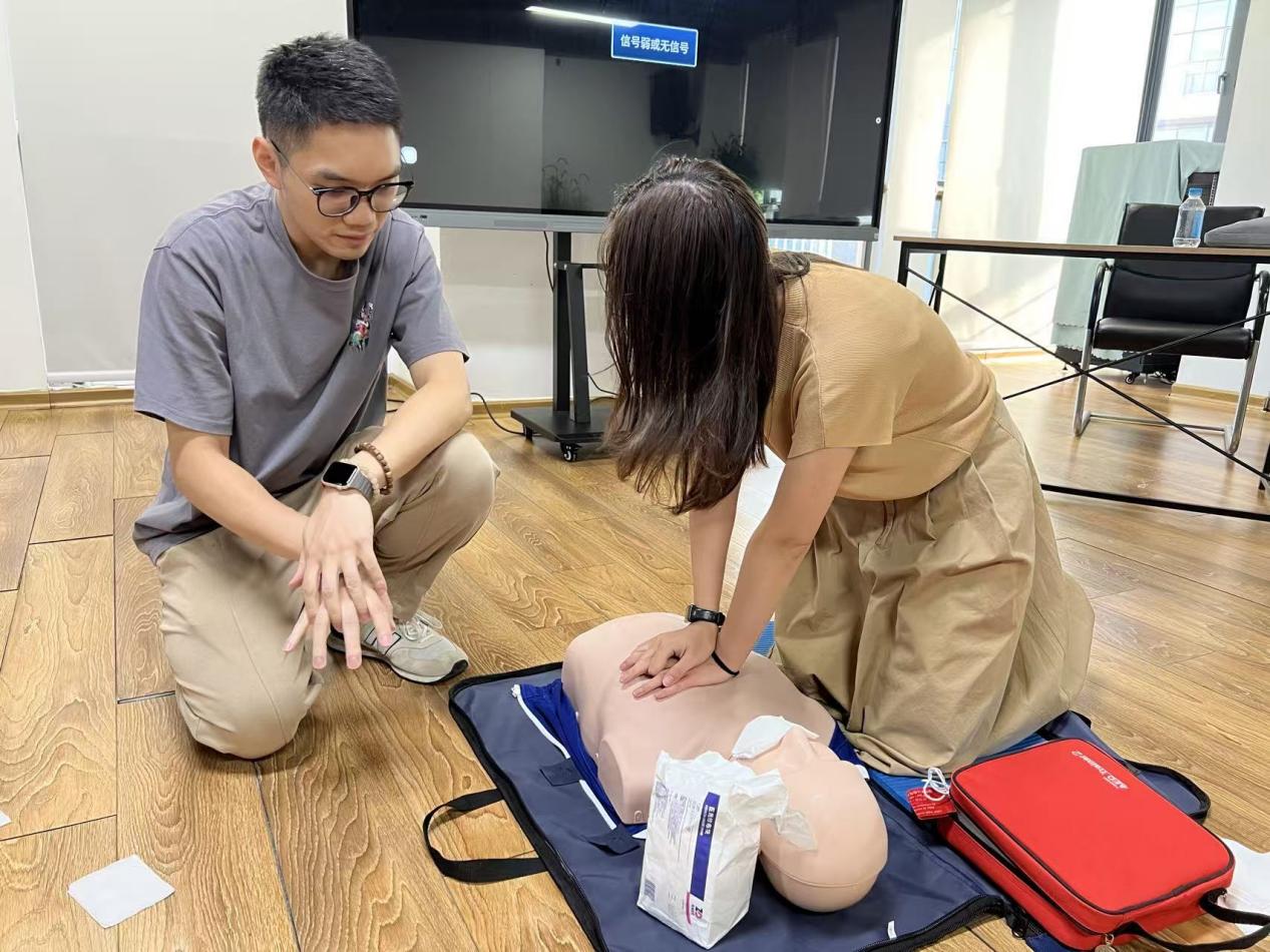 科普团队结合真实案例,围绕心肺复苏(CPR)操作、自动体外除颤器(AED)使用方法、气道异物梗阻急救处理等内容展开细致讲解,特别强调“黄金4分钟”在急救中的关键作用。培训中,团队通过模拟演练、一对一互动指导等形式,让职工亲身参与急救操作,有效提升职工应对突发状况的能力。