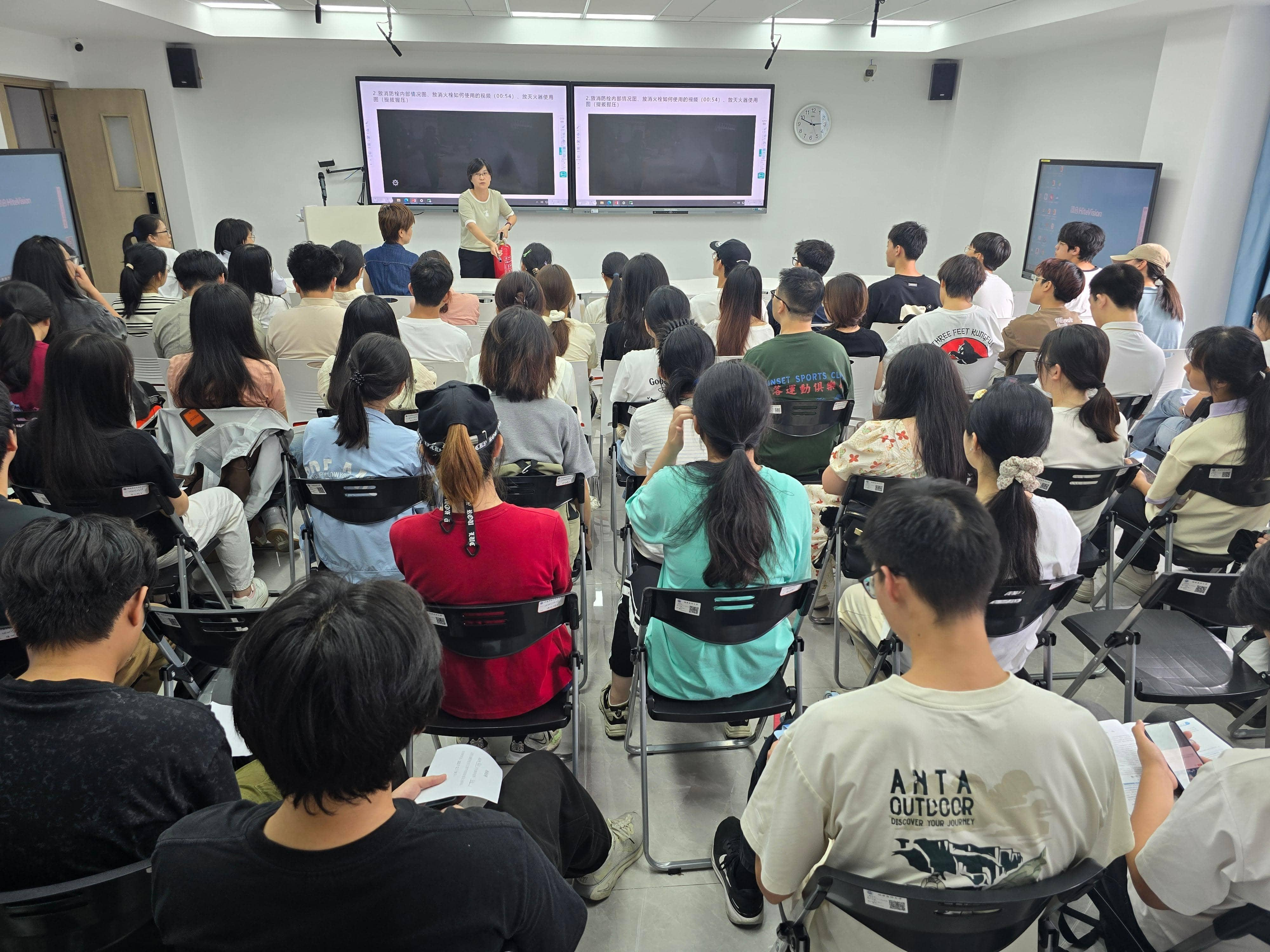 培训会上,党政管理办公室主任余燕针对校内常见的消防安全问题,为学生作了一场深入浅出、富有启发性的消防安全讲座,并现场示范了灭火器的正确使用方法。